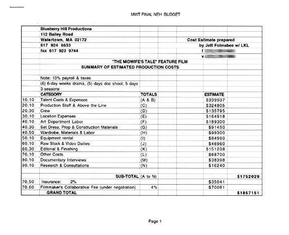 The process of budgeting a script often leads to rewrites -- and subsequent revisions of the budget. On A Midwife's Tale hard choices had to be made to cut some scenes (like the house-raising for the Ballard's new house) while other scenes were retained because it was felt they were essential to the historical and dramatic truthfulness of the film (the parade, the scene in church, for example). The initial film budget was an educated approximation based on assumptions about locations, cast and crew. Having worked on documentary films with a crew of five, budgeting for a dramatic shoot with a cast and crew of hundreds was a deep-end learning experience!