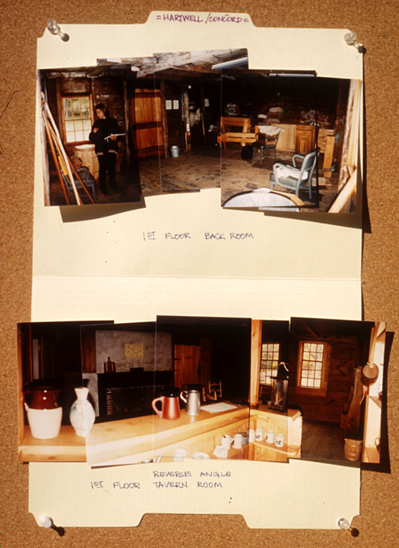 The production designer works closely with the director, the director of photography, and the costume designer. Together, they decide on "the look" of the film. On A Midwife's Tale, they began by looking at images of everyday life in American and European paintings and engravings from the period. They also looked at photographs of 20th century rural life and photographs of the Colonial Revival -- from the early part of this century. They used these images with caution, since the Colonial Revival often romanticized the past, and modern rural life is different in many ways than it was in Martha's time. But valuable lessons were gleaned from all of these images -- about the quality of light, the kinds of disarray or tidiness in a rural home, the look of smoke-stained walls, the kinds of objects typically left on mantle pieces, and hundreds of other details. Together the director, DP (director of photography), and production designer chose the palette for specific scenes and sets. Director Dick Rogers and DP Peter Stein conducted experiments with different kinds of lighting. Working with Dick and Peter, production designer Nancy Deren drew up ground plans showing how the buildings and gardens at Kings Landing could be adapted to match the script and enhance Dick's directing choices. Meanwhile, costume designer Kim Druce coordinated her costume plans with their choices, and drew up costume sketches.