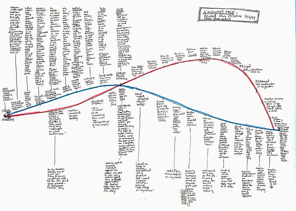 Filmmaking is storytelling, and the principles of story structure apply. Like plays or novels, films have protagonists and antagonists, conflicts, turning points, climaxes, and resolutions. In most films, there is a three-act structure at work. In the case of A Midwife's Tale, I had to interweave two stories: the story of Laurel Ulrich piecing together Martha Ballard's life and the story of Martha Ballard's life itself. To get a handle on each of these stories, I made color coded index cards with scenes I was considering including in the film. Martha's scenes were coded with red. Laurel's scenes were coded with blue. Spreading out the cards on my living room floor, I experimented with different ways to structure the double story. And I began to work out the seasonal cycle metaphor of the film. When I finally worked out something I liked, I drew it up as a story structure graph, with two intersecting story arcs. Laurel's arc (in blue) is dominant at the beginning of the film, and Martha's arc (in red) takes over at the point where the two women connect emotionally in the epidemic scene (the climax of Act I).